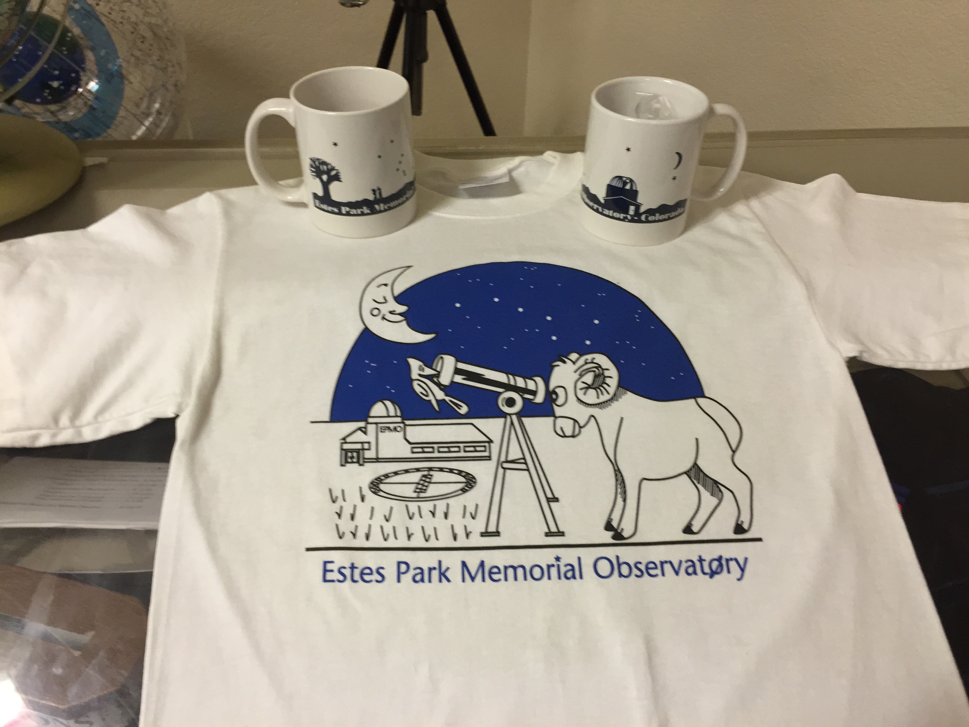 Our gift shop offers EPMO T-shirts with the adorable Rocky Mountain sheep peering through the telescope, coffee mugs, star charts, pencils, and more! Please stop in and support your local observatory. Here are some pictures of our merchandise. Not available for sale on-line (yet) but please come by or contact us if you are interested in any items below and we can ship to you.